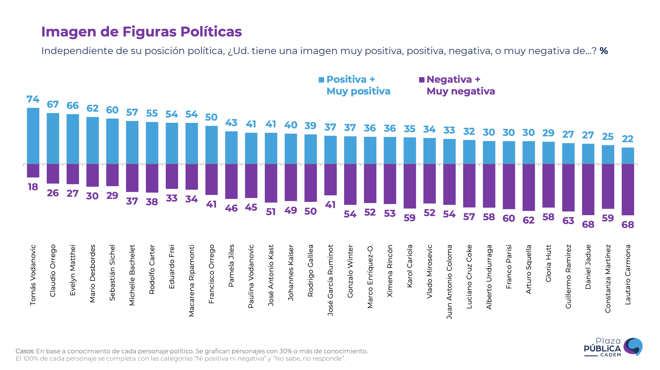 En imagen de personajes políticos, Tomás Vodanovic lidera con 74% (+2pts). Más atrás se ubican Claudio Orrego (67%), Evelyn Matthei (66%, -5pts), Mario Desbordes (62%) y Sebastián Sichel (60%, +1pto). Los peor evaluados son Daniel Jadue (27%, +7pts), Constanza Martínez (25%, +1pto) y Lautaro Carmona (22%, -1pto).