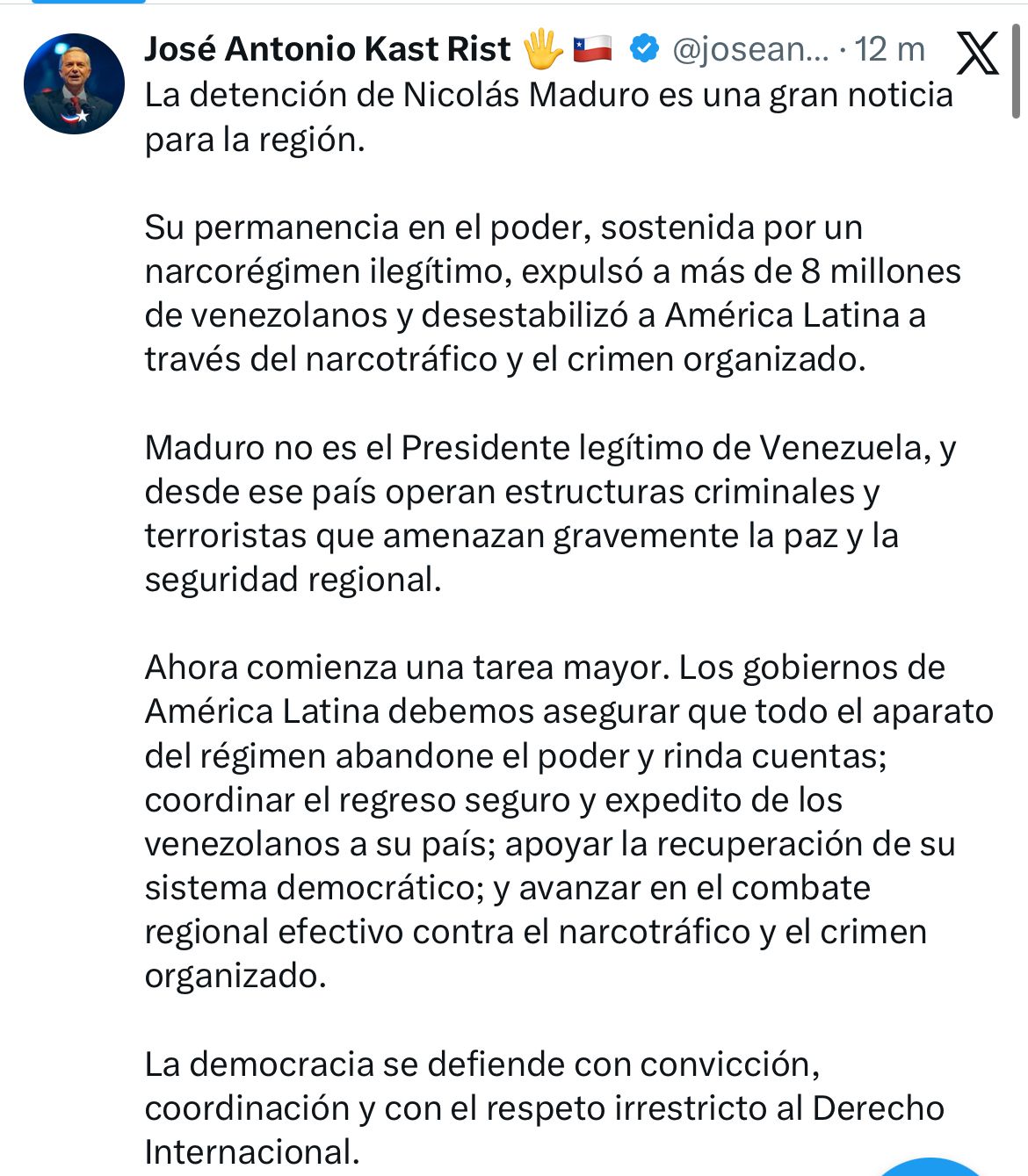 Asimismo, Kast advirtió que la detención del líder venezolano marca solo el inicio de una tarea mayor. En ese sentido, llamó a los gobiernos de América Latina a actuar de manera coordinada para asegurar que todo el aparato del régimen abandone el poder, rinda cuentas ante la justicia y se garantice un proceso ordenado de transición política.