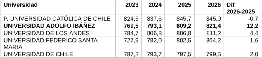 Asimismo, todas las carreras lanzadas en los últimos años registraron alzas significativas, al igual que las denominadas “carreras tradicionales” de la universidad. En este grupo, sobresale Ingeniería Comercial, tanto en Santiago como en Viña del Mar, con incrementos superiores a los 20 puntos en sus puntajes de corte.