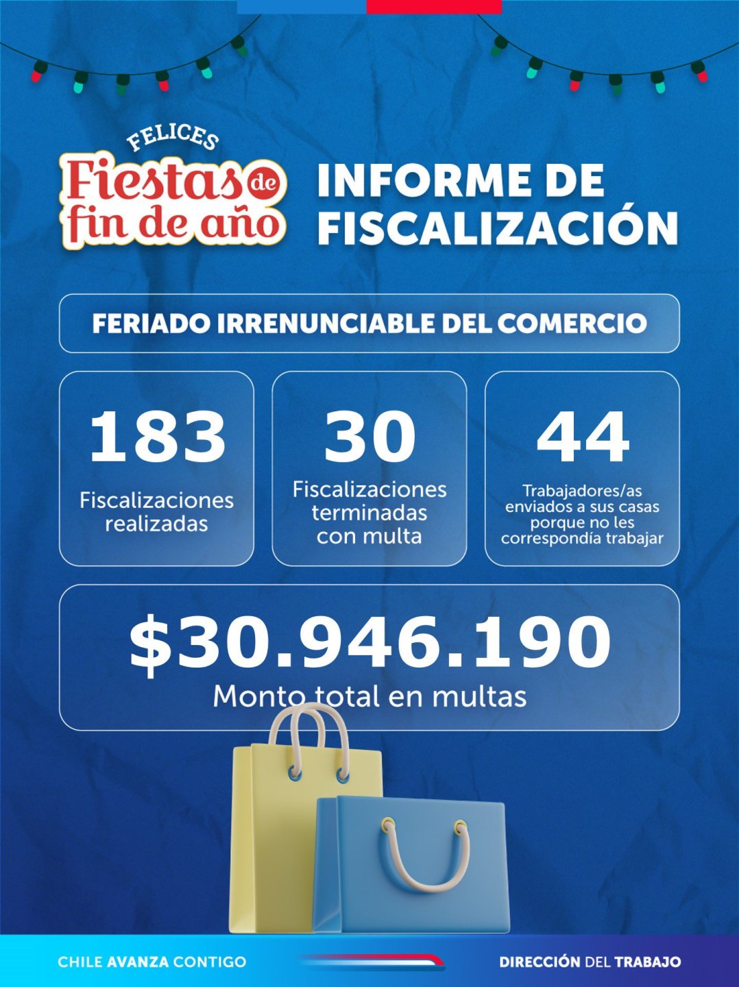 La Dirección del Trabajo cursó 30 multas por casi 31 millones de pesos, debido a incumplimientos del feriado legal irrenunciable de Año Nuevo en el comercio.