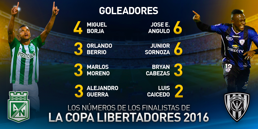 Hasta la final, Independiente del Valle anotó un total de 19 goles a favor, de los cuales más de la mitad fueron conseguidos por su delantero José Angulo (6) y su volante de armado Junior Sornoza (6). Por su parte, Atlético Nacional consiguió 23 goles a favor y, como dato curioso, es su reciente incorporación, el delantero Miguel Borja quien ha anotado la mayor cantidad de goles (4), seguido por los delanteros Orlando Berrio (3) y Marlos Moreno (3).