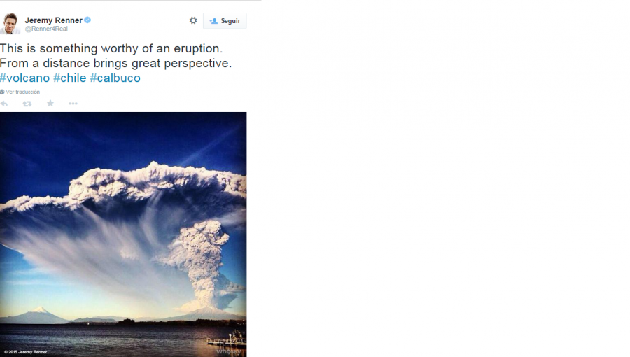 Las imágenes de la erupción del Volcán Calbuco han asombrado a Chile y el mundo a través las portadas de los medios de comunicación alrededor de todo el globo y muchos famosos han compartido su preocupación a través de las redes sociales, tal como lo hizo uno de los protagonístas de la saga de Marvel, Los Vengadores, Jeremy Renner.
