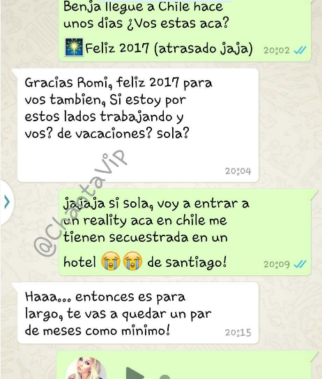 En la supuesta conversación, la chica reality dijo a Vicuña: "Te quiero agradecer por todos los consejos que me diste. Es increíble lo clara que la tenés. Me estás re ayudando", en referencia a la orientación que, según ella, el actor está dando a su carrera. Luego, Malaspina le preguntó si está solo, y él supuestamente contestó: "Mejor no hablar de ciertas cosas".
