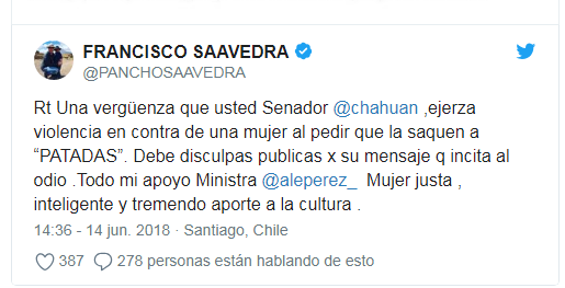 Francisco Saavedra, conductor de Lugares que Hablan, salió repudiando el hecho y tratando al senador de "poco hombre" señalando "una vergüenza que usted senador Chahuán, ejerza violencia en contra de una mujer al pedir que la saquen a 'PATADAS'. Debe disculpas públicas por su mensaje que incita al odio. Todo mi apoyo ministra Alejandra Pérez. Mujer justa, inteligente y tremendo aporte a la cultura".