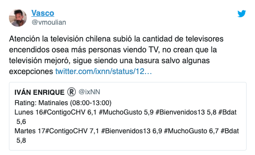 "Atención la televisión chilena subió la cantidad de televisores encendidos, osea, más personas viendo TV, no crean que la televisión mejoró, sigue siendo una basura salvo algunas excepciones", dijo a través de su cuenta de Twitter.