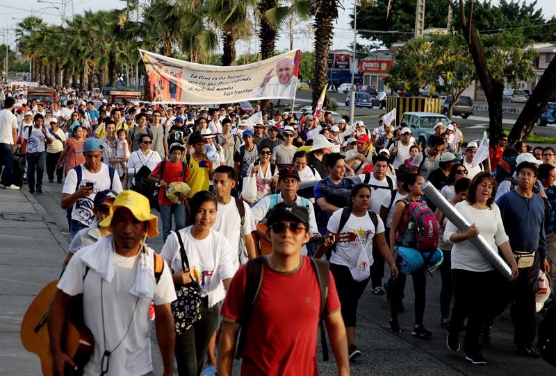 Miles de fieles se apostaron en las calles para recibir en Guayaquil, la ciudad más poblada del país, al papa Francisco, quien oficiará en esa ciudad la primera misa multitudinaria en Ecuador, adonde llegó el domingo en una visita que terminará el próximo miércoles.