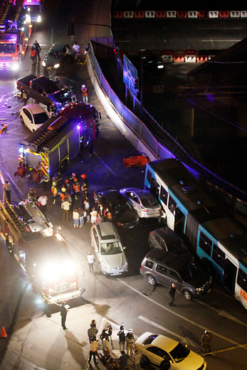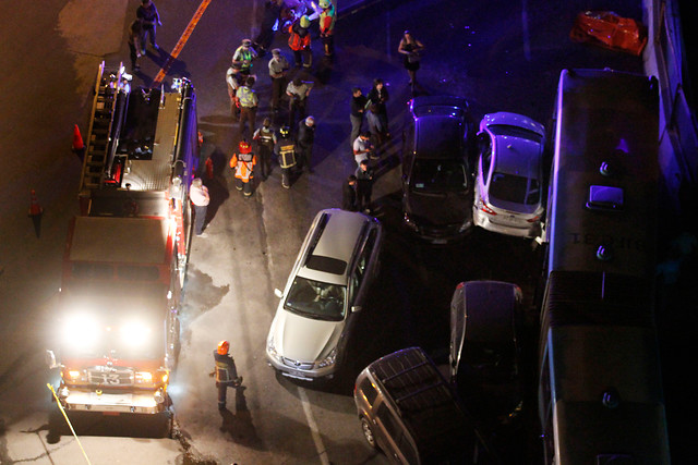 En la tarde de este jueves, un violento accidente se produjo en la comuna de Las Condes, específicamente en la rotonda Pérez Zujovic cuando ocho vehículos particulares y el bus del recorrido 502 del Transantiago protagonizaron una colisión múltiple.