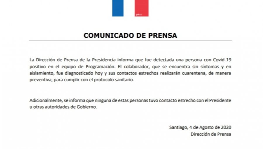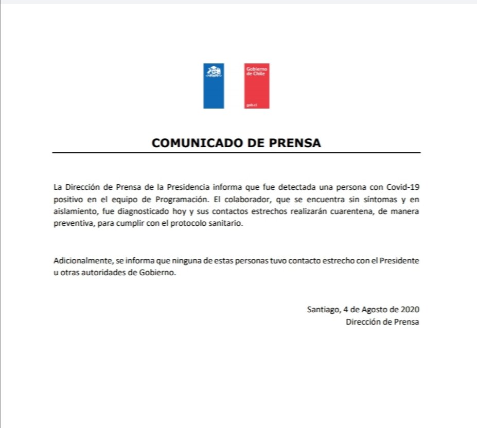 A través de una declaración pública se informó que la persona no mantuvo contacto estrecho ni con el presidente Piñera ni con otras autoridades.