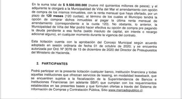 Tres meses después, el 30 de diciembre de 2020 precisamente, la Municipalidad de Viña del Mar publica la licitación «Leaseback de inmueble de la I. Municipalidad de Viña del Mar», la cual finalizó esta semana, trayendo consigo un duro golpe para la administración municipal.