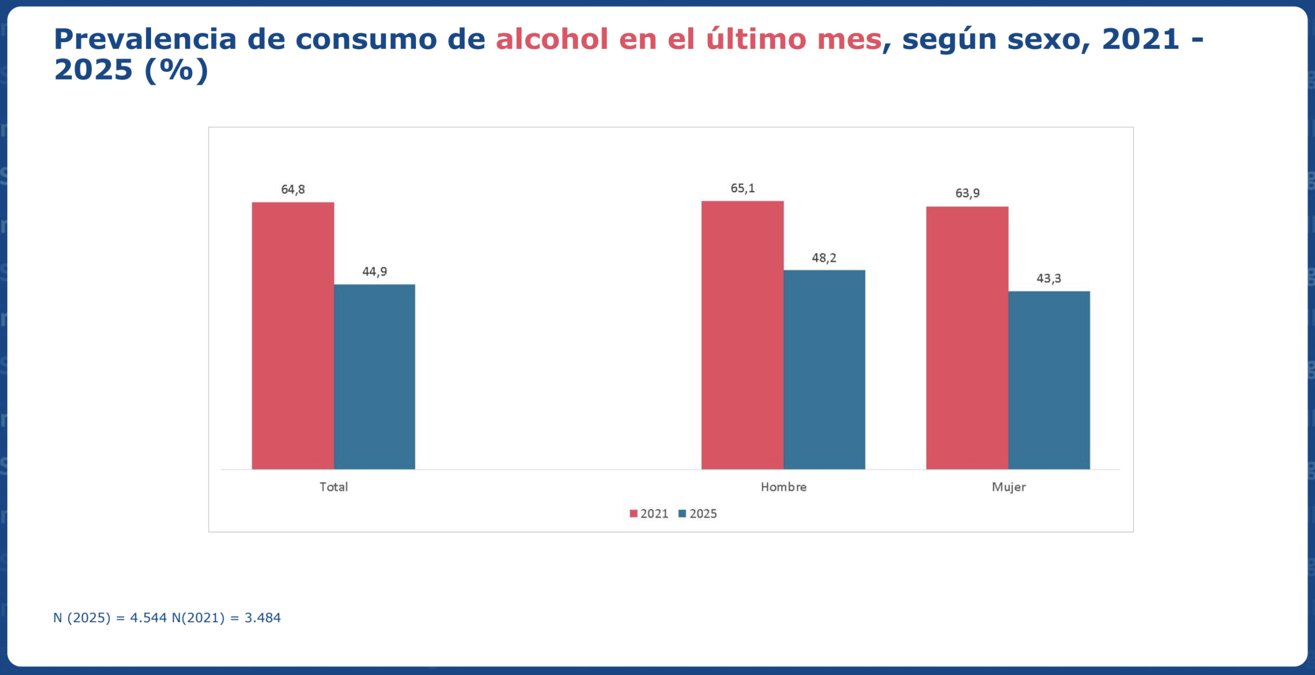 El primer dato da cuenta que la prevalencia de consumo de alcohol durante el último mes es de 44,9%, la cual es mayor para hombres (48,2%) que para mujeres (43,3%). Si la comparación se hace con el último estudio, llevado a cabo durante el año 2021, se puede observar una disminución de 19,8 puntos porcentuales en la prevalencia de consumo de alcohol durante el último mes (64,8% en la versión anterior).