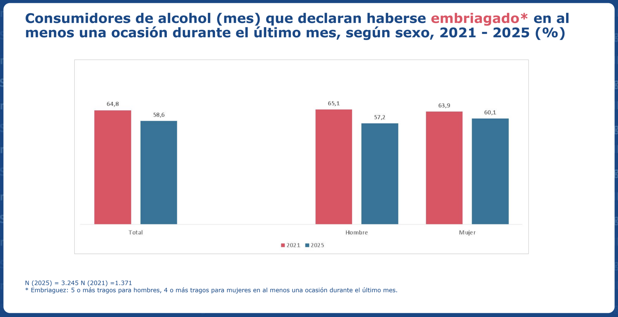 La preocupación se genera al advertir que entre quienes reconocen que han consumido alcohol durante el último mes, un 58,6% declara haberse embriagado en al menos una ocasión. En ese sentido, importante es tener en cuenta que el estudio muestra que la embriaguez es levemente mayor para mujeres (60,1%) que para hombres (57,2%). Al hacer la comparación con lo ocurrido hace cuatro años atrás, también se logra ver un retroceso, especialmente en hombres, que pasaron de 65,1% al mencionado 57,2%.