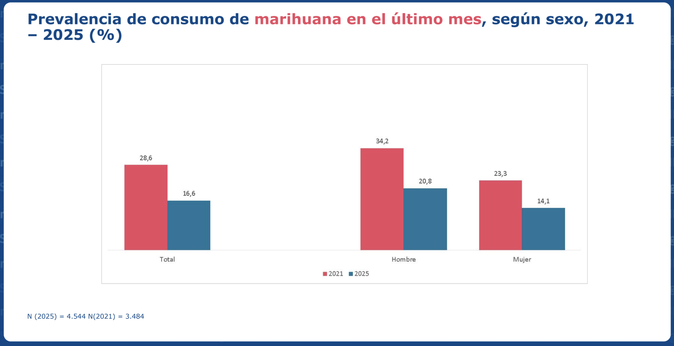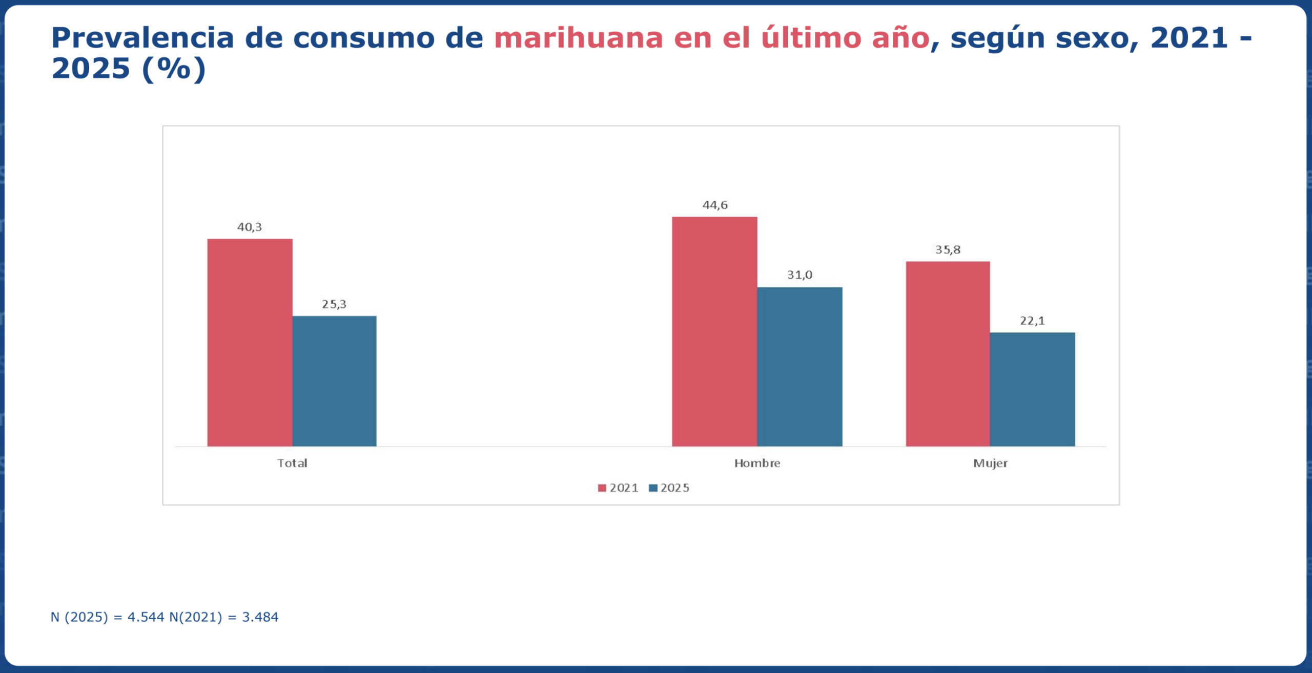 El Tercer Estudio de Drogas en Educación Superior 2025 –al que accedió Puranoticia.cl en su totalidad– muestra que la prevalencia de consumo de marihuana al año declarada por los estudiantes es de 25,3% durante 2025, vale decir 15 puntos más baja que la informada en el estudio del año 2021, cuando llegaba a 40,3%. Además, se observa que la prevalencia es mayor en hombres (31,0%) que en mujeres (22,1%).