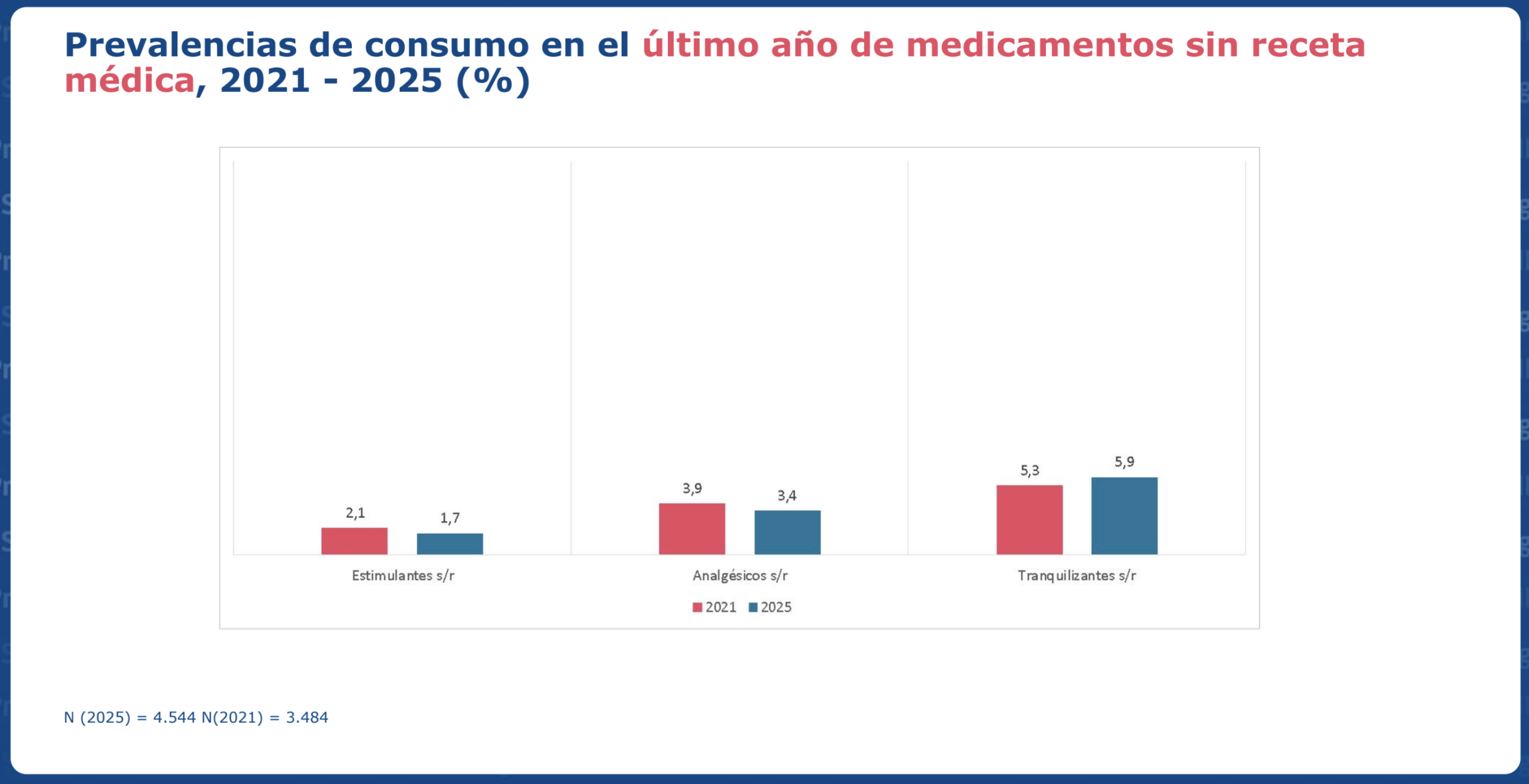 Cuatro de estas drogas presentan incrementos en relación a las cifras exhibidas durante el año 2021: tranquilizantes, que pasaron de 7,5% a 7,7% estos últimos cuatro años; analgésicos, que pasaron de 4,8% a 5,2%; estimulantes, que subieron de 1,5% durante 2021 a 3,3% durante 2025; y pasta base, que subió de 0,9% a 1,3% este año.