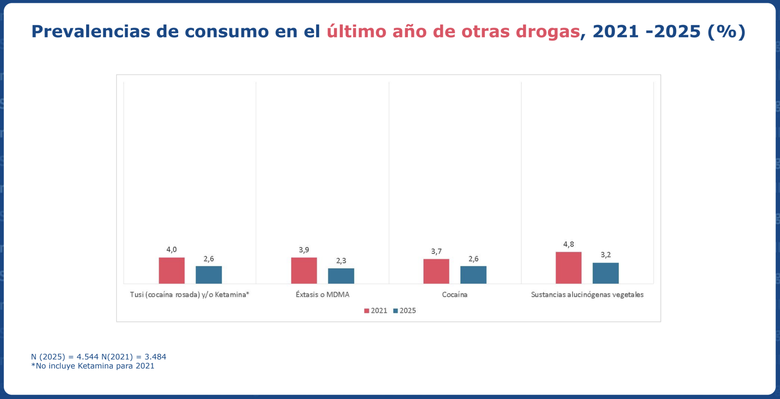 Acerca de la prevalencia de consumo de otras drogas durante el último año, el informe revela que el consumo de tusi (cocaína rosada) y/o ketamina bajó de 4,0% en 2021 a 2,6% en 2025; mientras que el uso de éxtasis o MDMA cayó de 3,9% a 2,3% en los últimos cuatro años; el consumo de cocaína se redujo de 3,7% en 2021 a 2,6% en 2025; y finalmente el uso de sustancias alucinógenas vegetales cayó de 4,8% a 3,2%.