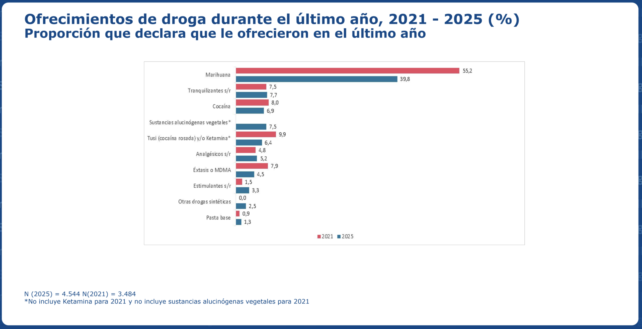 Respecto a los ofrecimientos de drogas durante el último año, la proporción de estudiantes de educación superior que declaran haber recibido ofrecimientos de marihuana durante el último año es 39,8% en 2025. En tanto, un 6,9% dice que le ofrecieron cocaína; un 4,5% menciona al éxtasis; un 7,7% declara que ha recibido ofrecimientos de tranquilizantes sin receta médica; un 5,2% de analgésicos; y 1,3% de los estudiantes asegura haber recibido ofrecimientos de pasta base el último año.