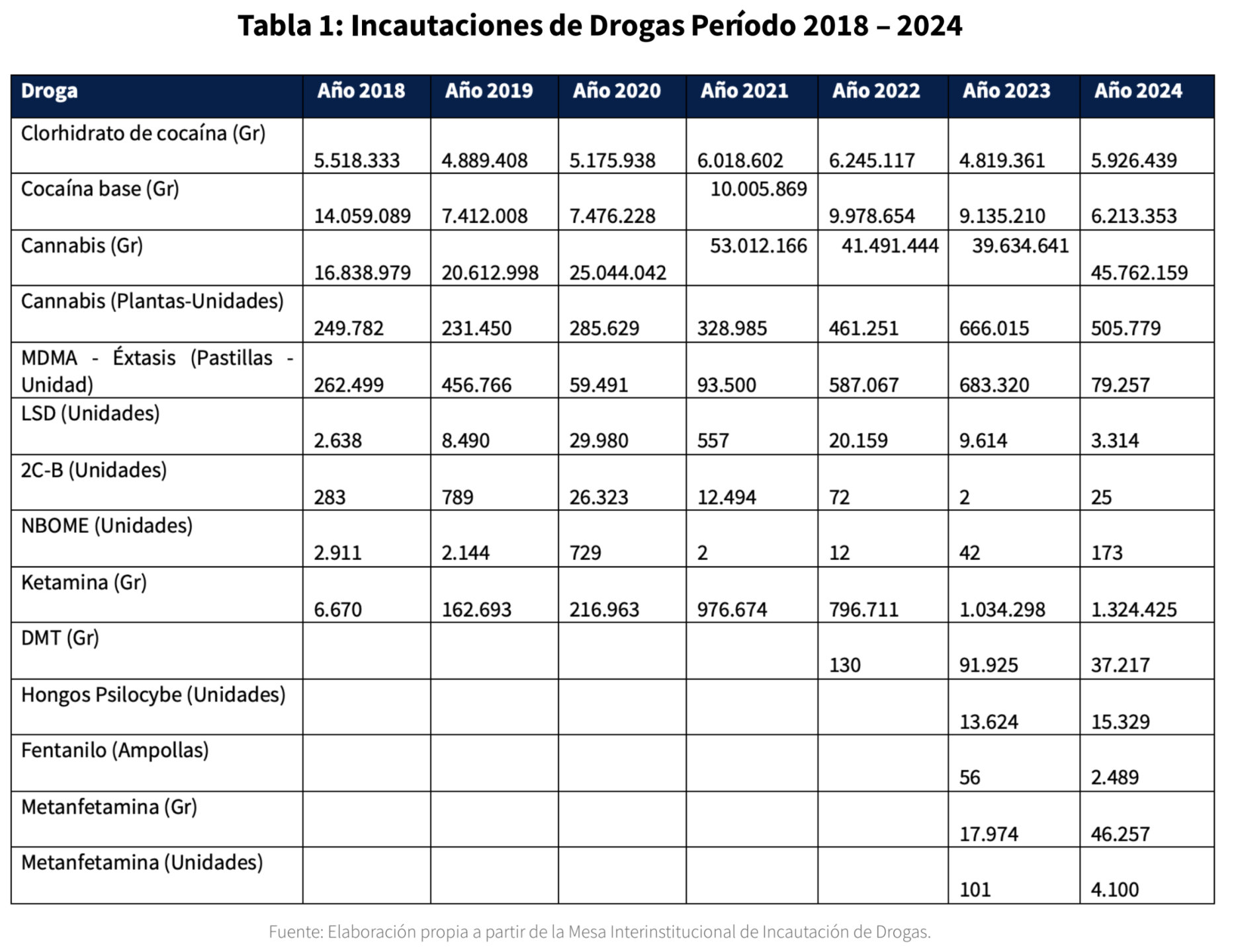 Estas son las cifras de incautaciones de drogas a nivel país, tabla que fue elaborada a partir del trabajo desarrollado por la Mesa Nacional de Incautaciones de Droga.