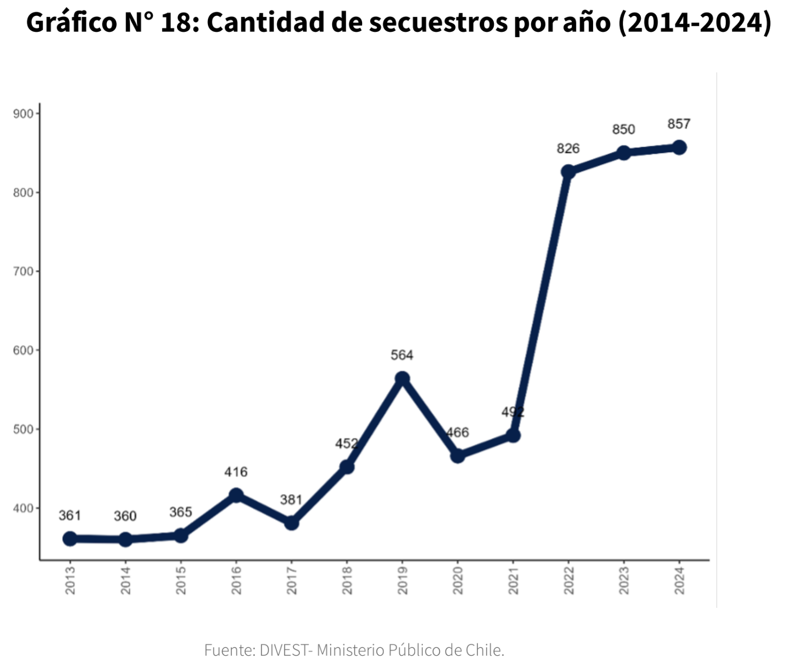 Chile ha experimentado durante los últimos años un aumento sostenido en las tasas de secuestro, fenómeno que da cuenta de la expansión y la sofisticación de estructuras criminales que han incorporado este delito como mecanismo de financiamiento. Los últimos tres años los secuestros se han mantenido por sobre los 800 casos anuales, alcanzando un máximo histórico de 868 ingresos durante el año pasado 2024; esto, asociado con la consolidación de prácticas de secuestro vinculadas al crimen organizado transnacional, que combinan extorsión, ajuste de cuentas y disciplinamiento interno.