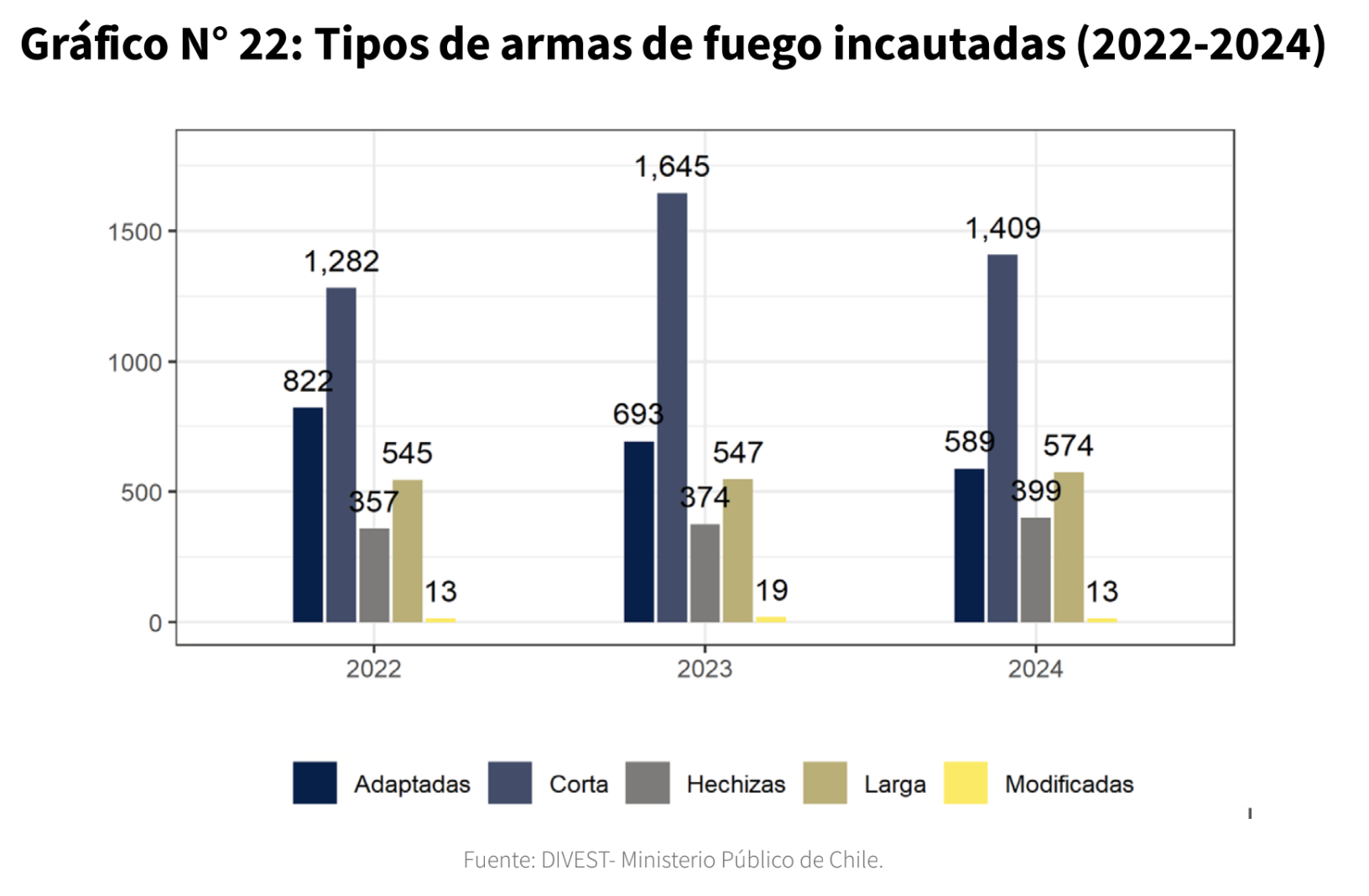 El alza en delitos de porte de armas de fuego (y otros delitos de la Ley de Armas) en los últimos años destaca como uno de los factores explicativos de la incipiente consolidación del crimen organizado, ya que, según el Reporte Anual 2023 de Homicidios, del total de casos de homicidios en ese contexto, 52% fue cometido con arma de fuego. El estudio muestra que en el periodo analizado, Carabineros de Chile incautó un total de 9.281 armas de fuego: 3.019 el año 2022, 3.278 el año 2023 y 2.984 el año 2024.