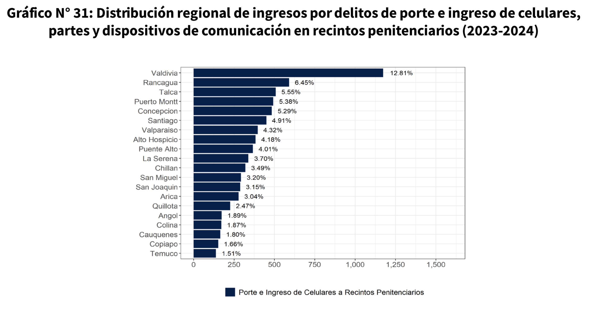 En cuanto al mercado ilícito de teléfonos celulares en recintos penitenciarios, en el 2024 se registraron 7.772 casos vinculados, en comparación con los 1.376 del 2023. En este contexto, el informe da cuenta que hay videos de dispositivos ubicados al interior de las cárceles de la región de Valparaíso, con registros de golpizas y torturas a internos como demostración de violencia, fuerza física y control por parte de los demás internos. El estudio también muestra que 4,32% de los ingresos por delitos de porte e ingreso de celulares fueron en Valparaíso y el 2,47% en el establecimiento penal de Quillota.