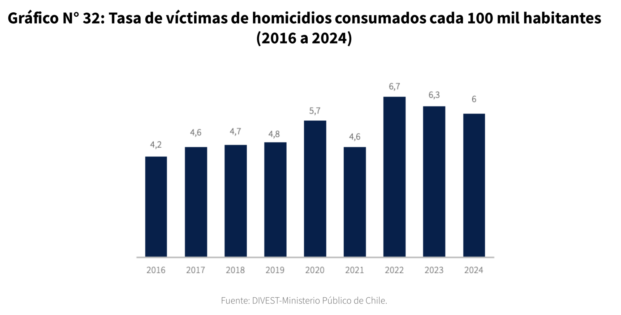 En el plano estadístico, Chile ha registrado dos años consecutivos de descenso en la tasa de homicidios consumados: en 2023, la tasa fue de 6,3 homicidios por cada 100.000 habitantes, mientras que en 2024 se redujo a 6,0 por cada 100.000 habitantes. Este descenso, aunque moderado, es significativo en contexto de alta presión del crimen organizado, y sugiere que las estrategias investigativas especializadas comienzan a mostrar efectos en la contención y persecución penal de este fenómeno.