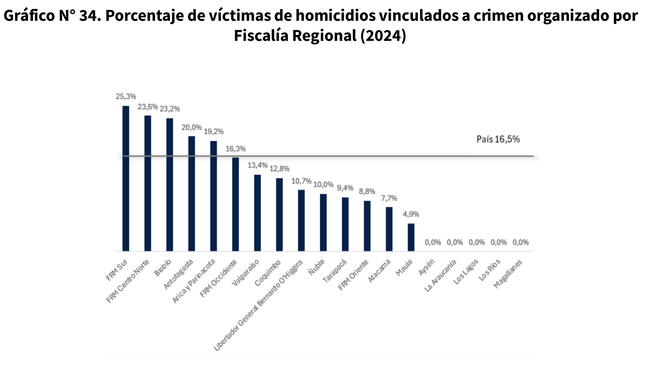 El informe de la Fiscalía Nacional muestra que durante 2024, el 16,5% de los homicidios en Chile estuvo vinculado a dinámicas de crimen organizado. Sin embargo, la proporción varía considerablemente por región: por ejemplo, la Fiscalía Regional de Valparaíso concentra 13,4% de víctimas de asesinatos asociados a crimen organizado.