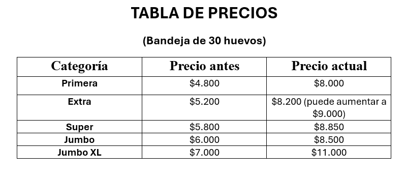 Por su parte, los huevos tipo super alcanzan actualmente los $8.850, tras costar anteriormente $5.800, mientras que la categoría jumbo aumentó de $6.000 a $8.500. En el segmento más alto, los huevos jumbo XL registran el mayor valor, llegando a los $11.000 por bandeja, luego de costar $7.000.