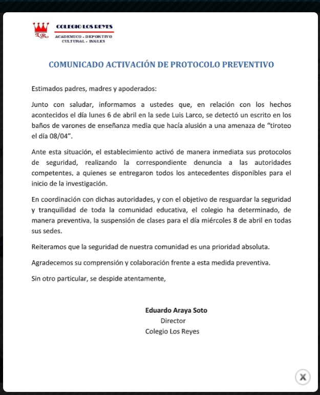 Desde el colegio presentaron un comunicado explicando y detallando la situación, en el que señalaron que “en coordinación con dichas autoridades, y con el objetivo de resguardar la seguridad y tranquilidad de toda la comunidad educativa, el colegio ha determinado, de manera preventiva, la suspensión de clases para el día miércoles 8 de abril en todas sus sedes”.