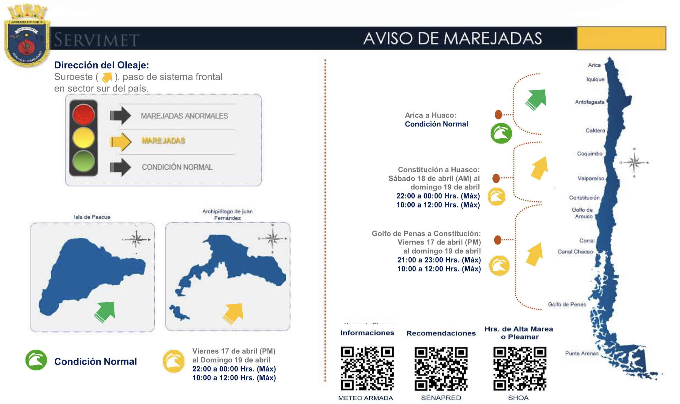 El jefe del Centro Zonal de Meteorología Marina de Valparaíso, capitán de Fragata Carlos Gaete, explicó que "debido a un activo sistema frontal que afectará el sector sur, esperamos marejadas con dirección del suroeste desde el viernes 17 en nuestro litoral, afectando desde Golfo de Penas hasta Huasco incluyendo el archipiélago Juan Fernández, generando oleaje con rompiente en bahías abiertas a esa dirección".