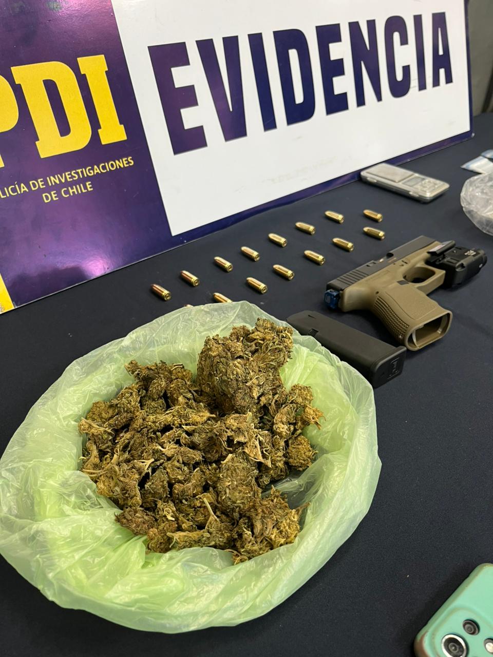 Durante el operativo, uno de los detenidos intentó darse a la fuga, siendo rápidamente interceptado por los detectives. Al momento de su aprehensión, el sujeto portaba un arma de fuego marca Glock, con su cargador completo y 15 municiones calibre 9 milímetros.
