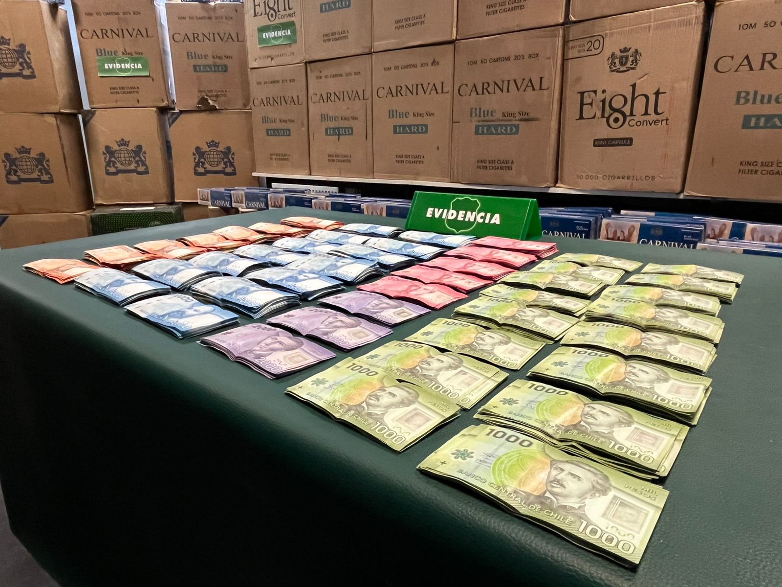En específico, en el procedimiento se incautaron 19.730 cajetillas de cigarros de diferentes marcas, avaluadas en $39.460.000; 140 sacos de 20 kilos de tabaco a granel, avaluados en $6.000.000; un vehículo; y $5.380.000 en dinero en efectivo.
