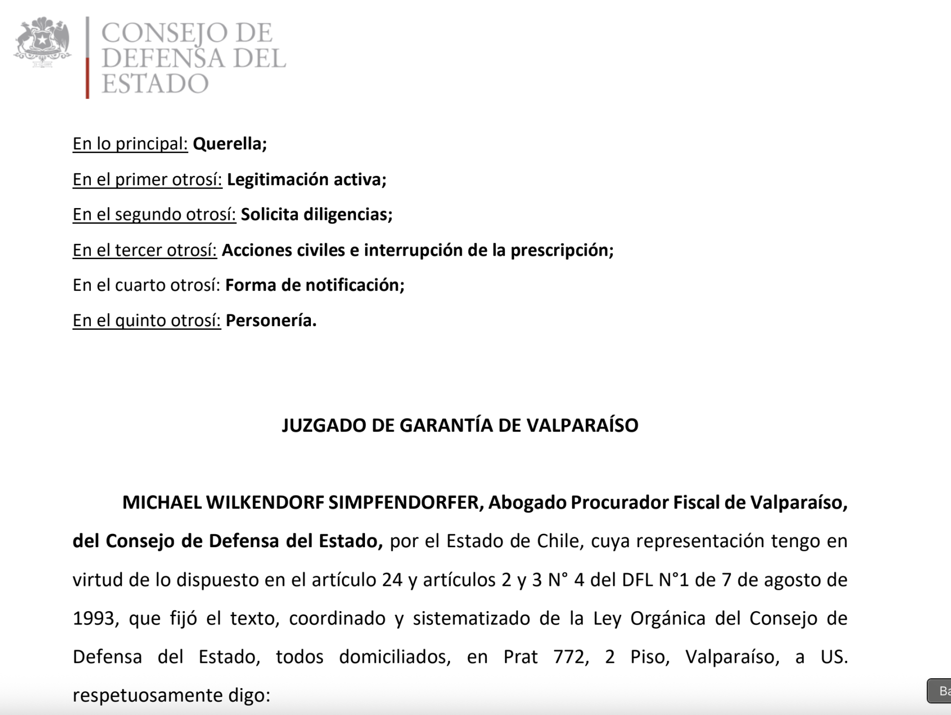 La querella criminal del Consejo de Defensa del Estado (CDE) se presentó el 24 de noviembre ante el Juzgado de Garantía de Valparaíso, cuyo juez Camilo Obrador la declaró admisible tan sólo dos días después, el 26 de noviembre.