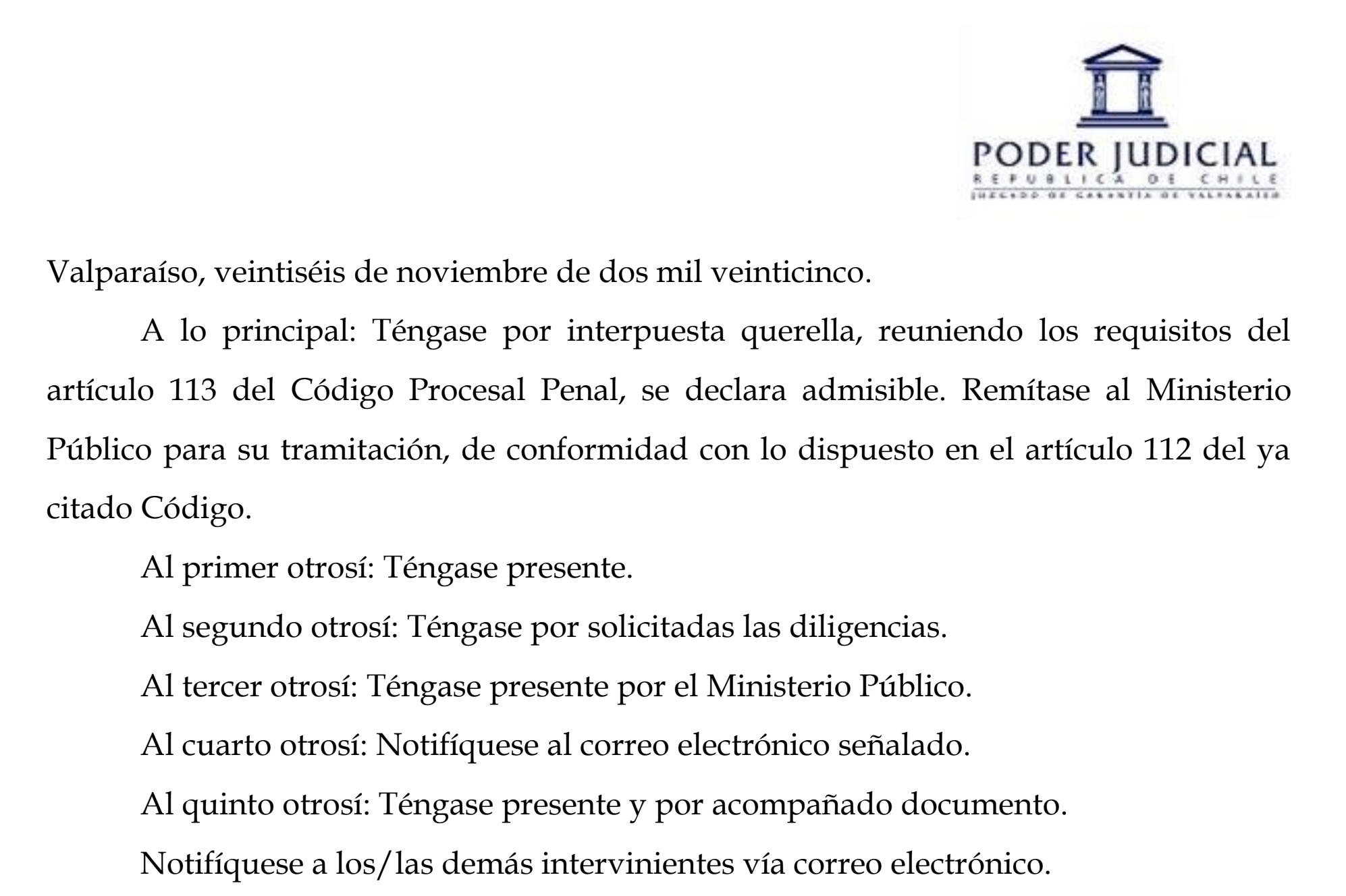 "Téngase por interpuesta querella, reuniendo los requisitos del artículo 113 del Código Procesal Penal, se declara admisible. Remítase al Ministerio Público para su tramitación, de conformidad con lo dispuesto en el artículo 112 del ya citado Código", se indica en el documento firmado por el juez de garantía de Valparaíso.