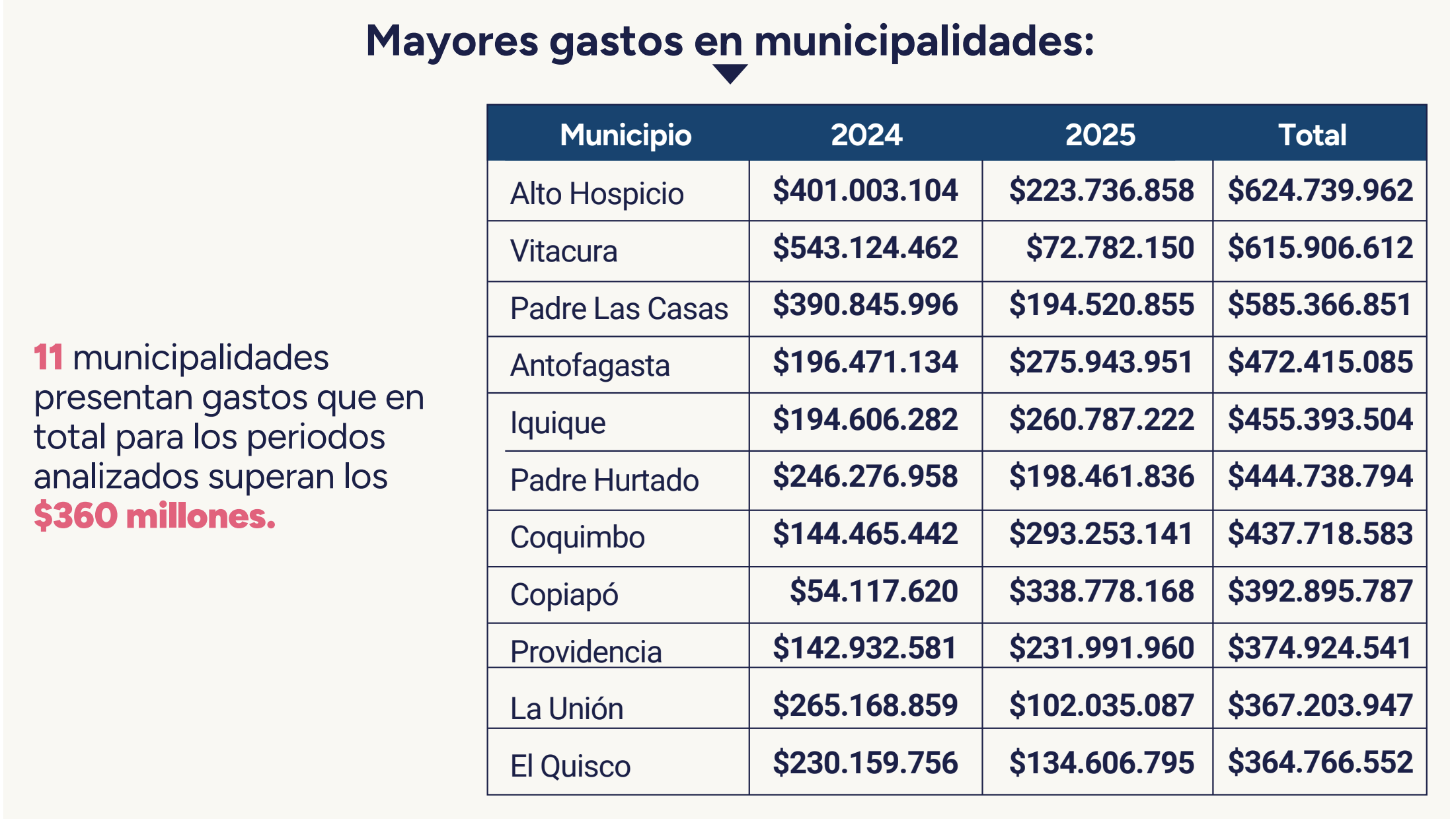 El informe indica que 11 municipalidades registraron gastos que superan los $360 millones en el periodo analizado. El ranking es liderado por el Municipio de Alto Hospicio, con un total de $624 millones entre 2024 y 2025, seguido por la de Vitacura, con $615 millones, y la Municipalidad de Padre Las Casas, con $585 millones.