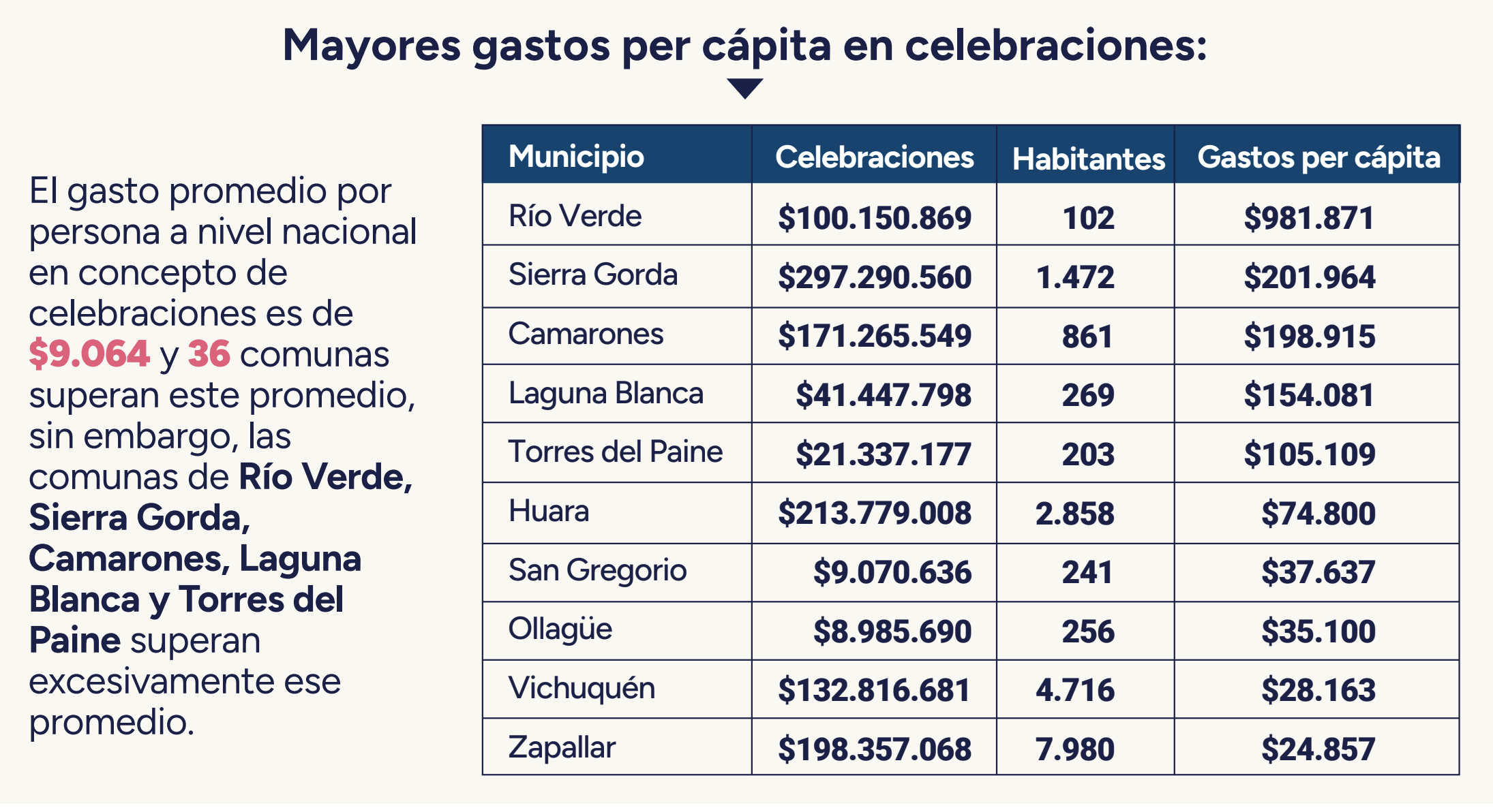 El gasto promedio por persona a nivel nacional en concepto de celebraciones es de $9.064 y 36 comunas superan este promedio, sin embargo, las comunas de Río Verde ($981.871), Sierra Gorda ($201.964), Camarones ($198.915), Laguna Blanca ($154.081) y Torres del Paine ($105.109) superan excesivamente ese promedio.