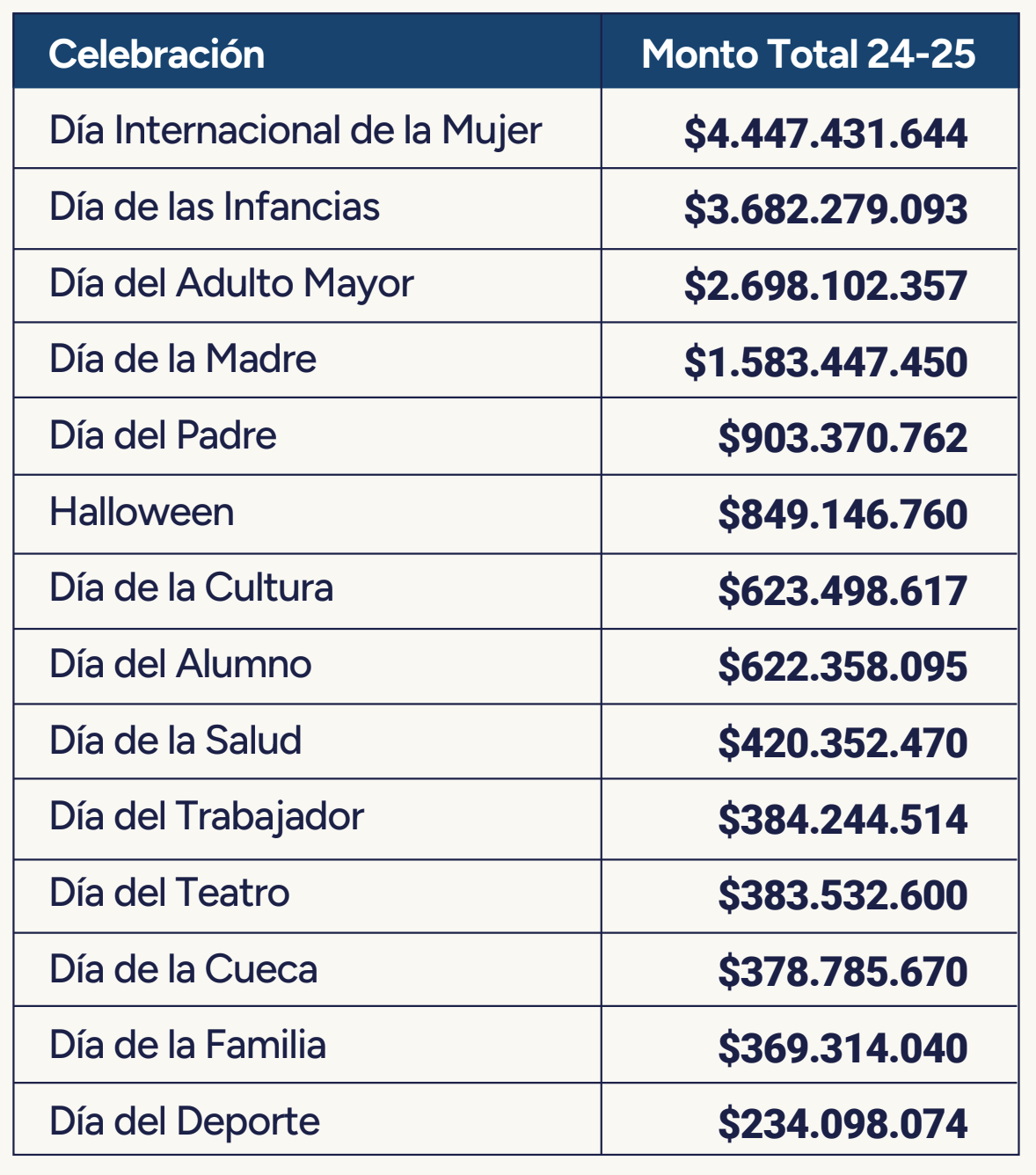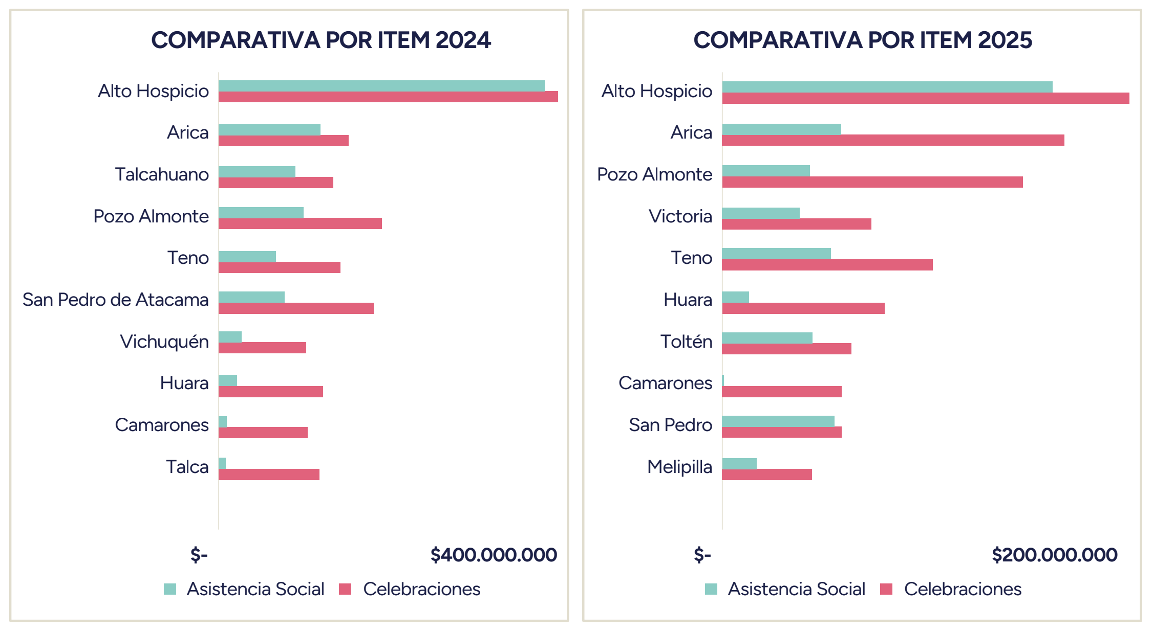 El análisis también revela que el gasto total en celebraciones, derivado de órdenes de compra municipales, asciende a más de $31 mil millones en el país. En 2024, 118 municipios superaron el promedio nacional de $51 millones en este ítem, mientras que en 2025 fueron 104 los que sobrepasaron el promedio de $38 millones.