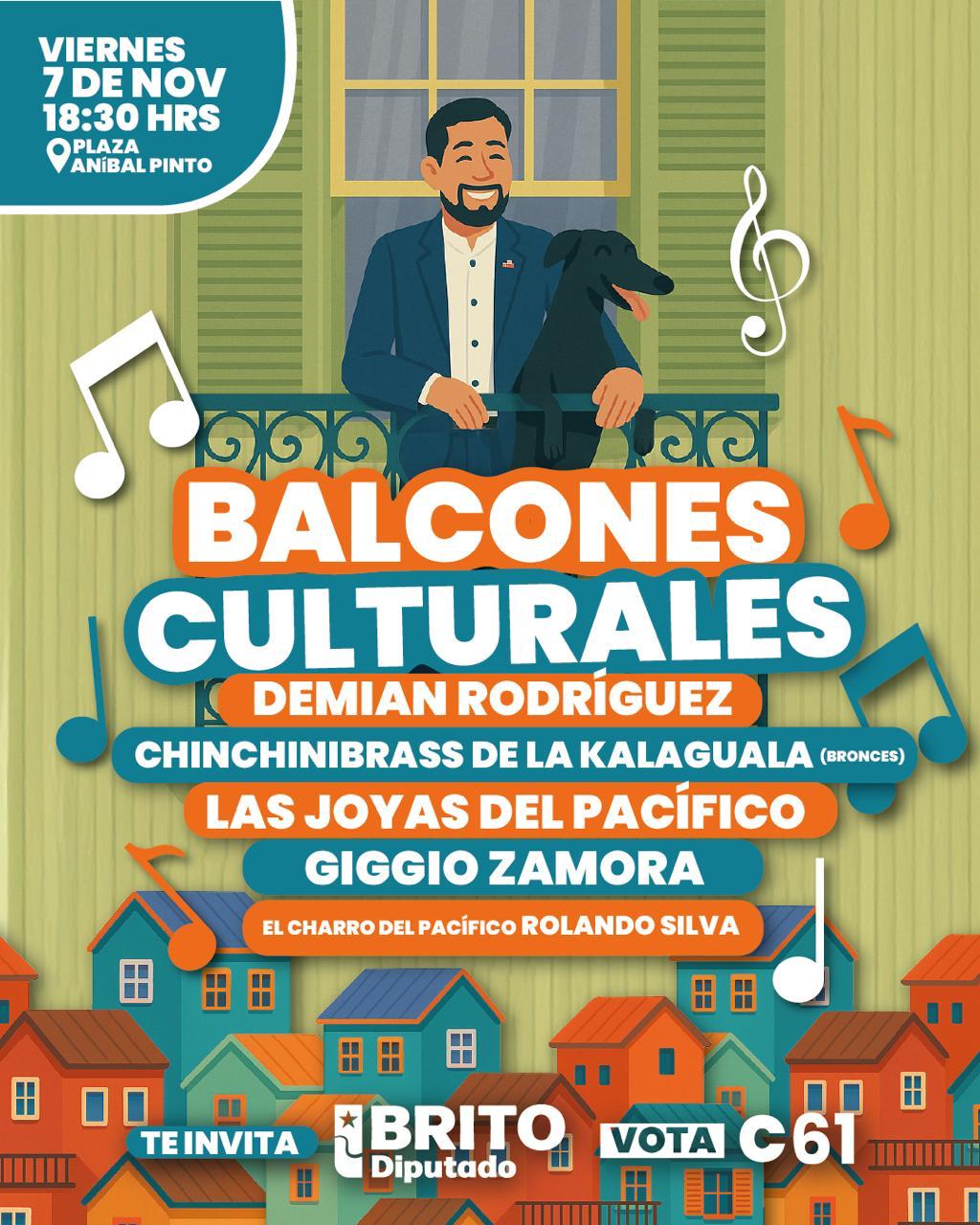 En el marco del cierre de campaña del diputado Jorge Brito Hasbún (C-61), este viernes 7 de noviembre, a las 18:30 horas, en la plaza Aníbal Pinto de Valparaíso, regresan los tradicionales Balcones Culturales, un panorama gratuito y emblemático que durante años llenó de música, alegría y vida los rincones del puerto.