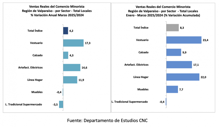 Según el índice que elabora mensualmente la Cámara Nacional de Comercio, Servicios y Turismo de Chile (CNC),las ventas presenciales minoristas de la región de Valparaíso marcaron en marzo un crecimiento real anual de 4,2%, desacelerándose frente a las alzas anteriores y cerrando el primer trimestre del 2025 con un incremento de 8,3%.