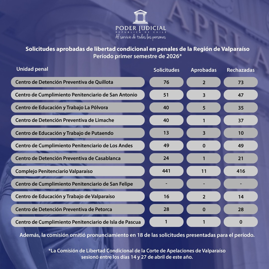 En su primera sesión el año, la Comisión de Libertad Condicional de la Corte de Apelaciones de Valparaíso acogió 29 postulaciones de las 779 revisadas, lo que corresponde al 3,7% de las carpetas ingresadas desde los centros penales de la región.