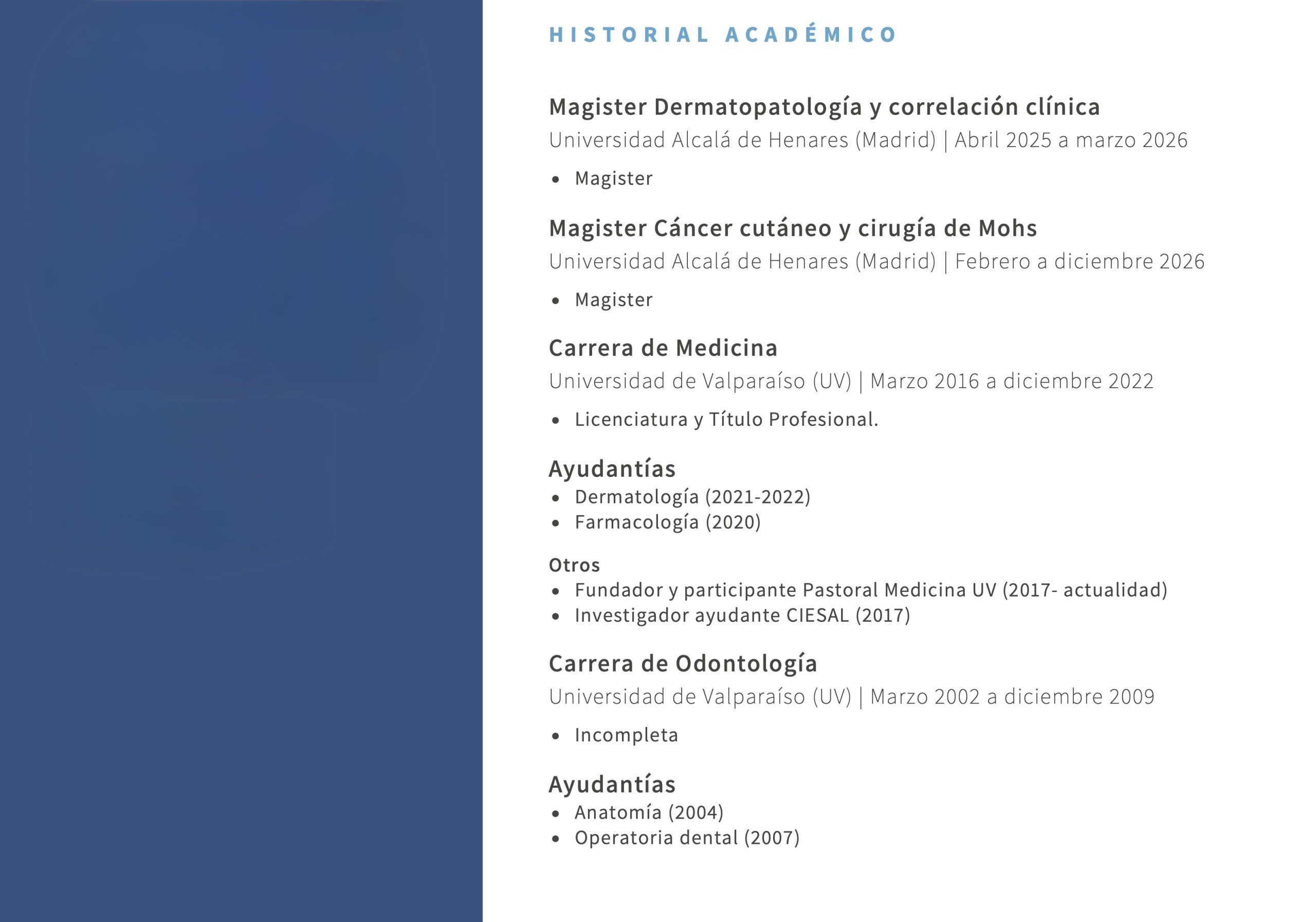 Ibani declara en el documento contar con dos programas cursados en la Universidad de Alcalá, en España: un Magíster en Dermatopatología y Correlación Clínica, cursado entre abril de 2025 y marzo de 2026; y un Magíster de Cáncer Cutáneo y Cirugía de Mohs, que inició en febrero y se extenderá hasta diciembre de 2026