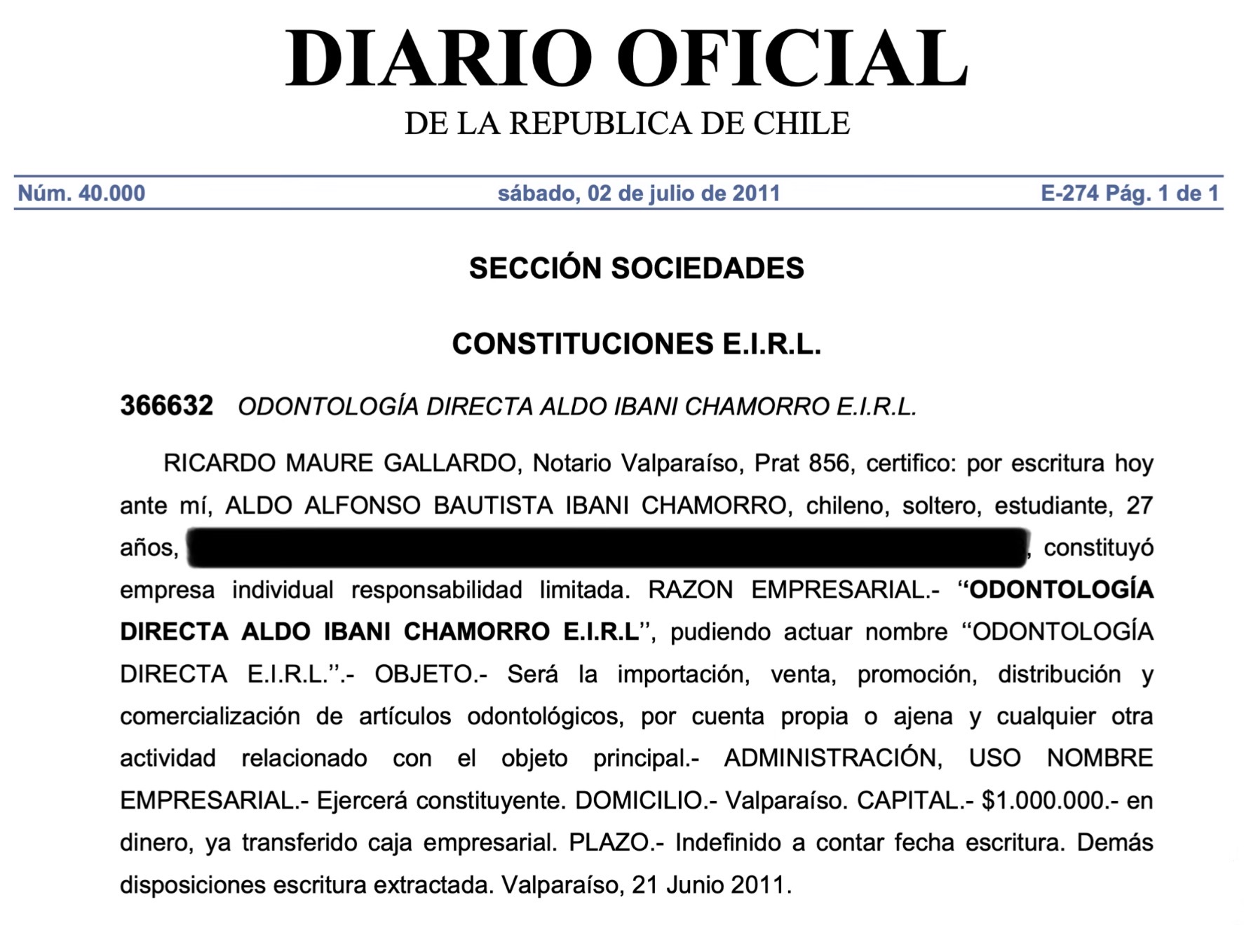 Otro de los antecedentes que genera cuestionamientos respecto del nuevo Seremi de Salud corresponde a la constitución de una empresa individual de responsabilidad limitada en 2011, denominada «Odontología Directa Aldo Ibani Chamorro E.I.R.L.».