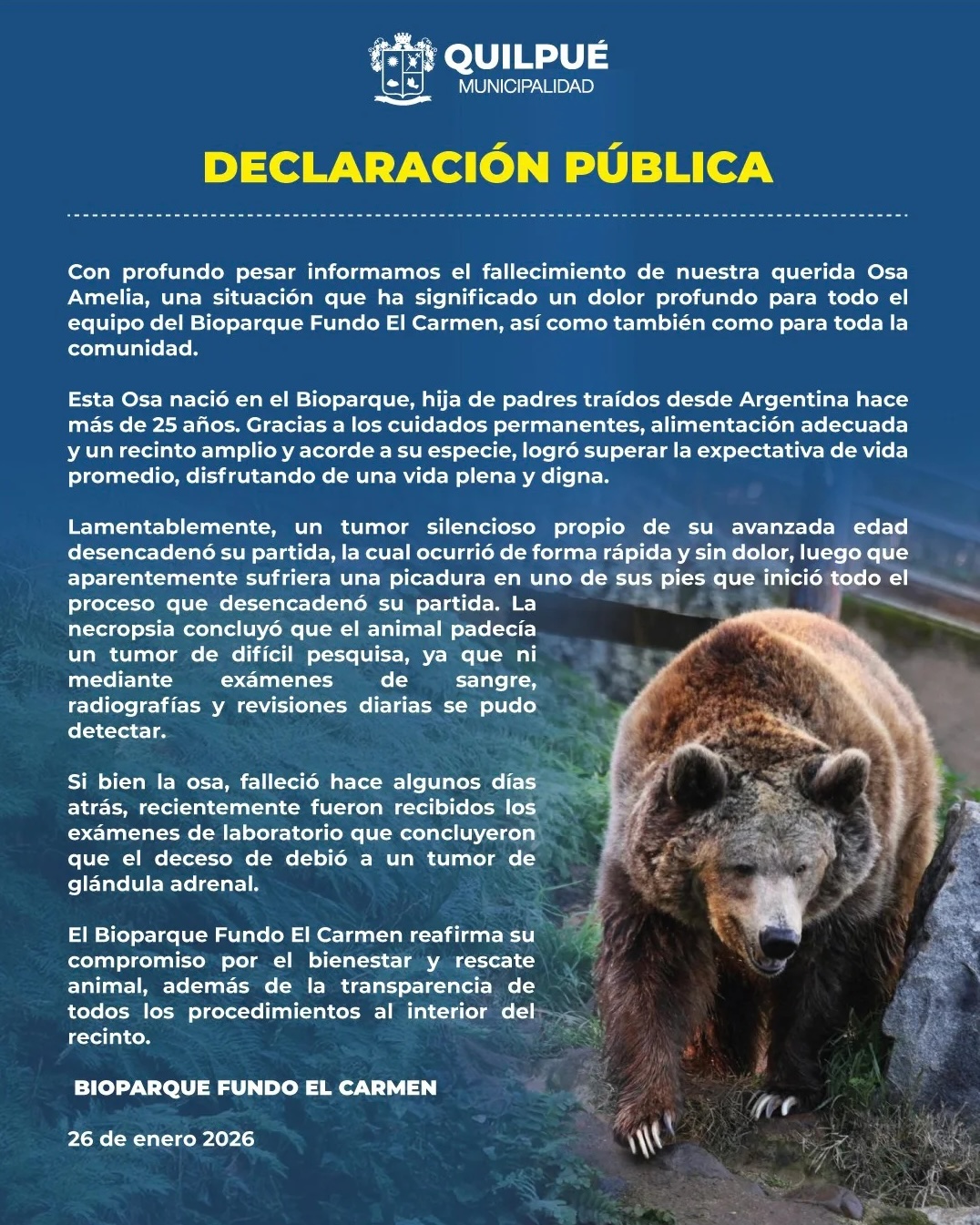 El Bioparque Fundo El Carmen confirmó la muerte de la osa parda Amelia, que tenía más de 20 años de edad.