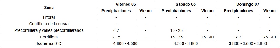 Asimismo, conforme a lo indicado en el alertamiento vigente y en el Informe de Amenaza Meteorológica de la DMC, los montos de precipitaciones (mm/cm), viento (km/h) e isoterma 0°C (m.s.n.m.) pronosticados para los próximos días en la región, son los siguientes: