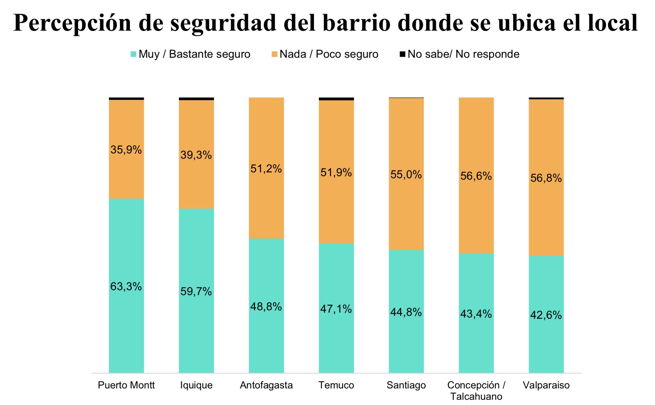 En términos regionales, todas las ciudades encuestadas, a excepción de Iquique, evidenciaron alzas significativas en la percepción de inseguridad comparado con la medición anterior. Las ciudades con mayores niveles de inseguridad son Valparaíso-Viña del Mar con 56,8%; Concepción-Talcahuano, donde un 56,6% de los encuestados menciona que el lugar donde se ubica su negocio es poco o nada seguro y luego le sigue Santiago (55%).