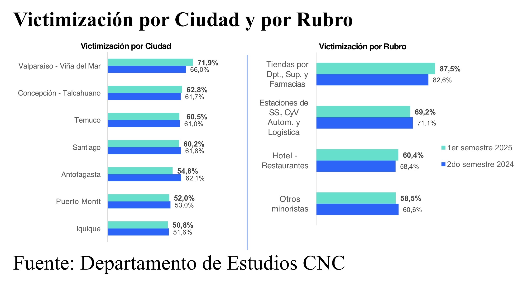 El sondeo, que se realizó entre el 1 de julio hasta el 13 de agosto de 2025 a 1.202 establecimientos de Iquique, Antofagasta, Viña del Mar-Valparaíso, Gran Santiago, Concepción-Talcahuano, Temuco y Puerto Montt, da cuenta de una tasa de victimización de 60,4%, resultado en el que no se aprecian cambios significativos respecto a la medición anterior en términos generales, pero si se ve un continuo aumento en las capitales regionales evaluadas. Se aprecia un alza significativa en Valparaíso-Viña del Mar respecto a la medición anterior y una baja en Antofagasta.