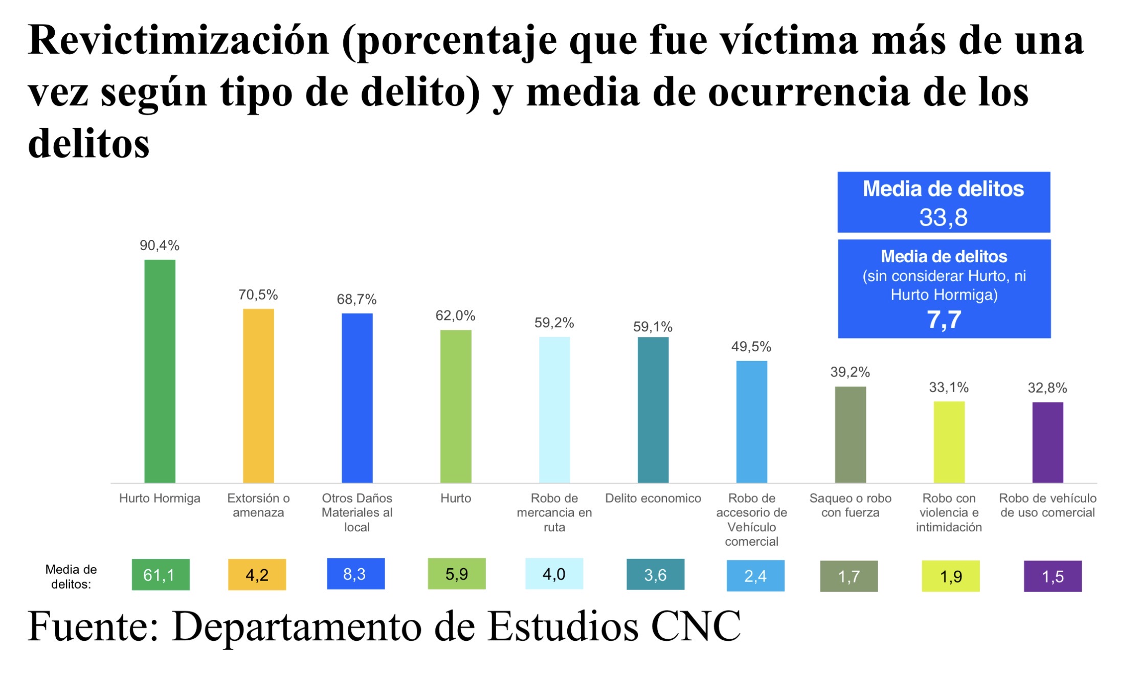 Aquellos que son víctima de delitos lo son en su mayoría más de una vez, con una media de 33,8 veces, significativamente superior a la medición anterior y sin considerar el hurto y hurto hormiga la media de delitos es 7,7 veces por local victimizado.