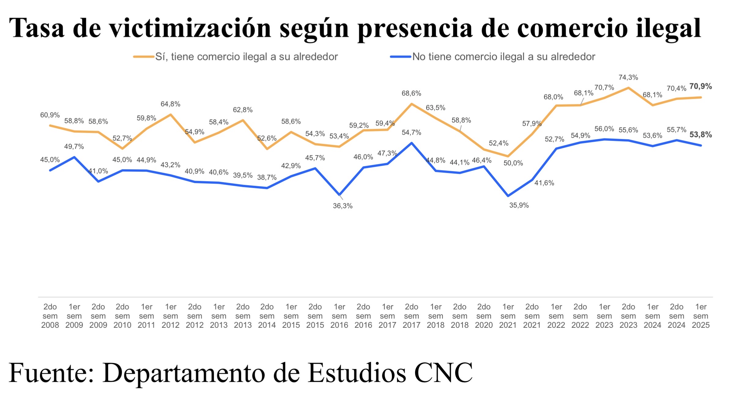 Al igual que en sondeos anteriores, esta condición tendría cierta incidencia en los niveles de victimización, ya que el 70,9% de los negocios que reportan presencia de comercio ilegal en las cercanías fue víctima de algún delito o falta en el primer semestre de 2025 y en cuanto a los que no tienen comercio ambulante a su alrededor, un 53,8% fueron víctima de algún delito.