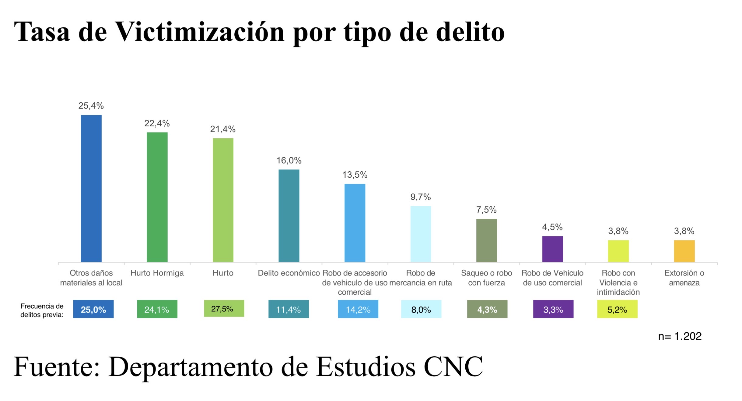 Hurto hormiga, con un 34,5%; y Otros daños materiales al local, con un 33,5%, encabezan la lista de delitos en la ciudad; seguidos de Hurto con 27,3%; Delito económico, con 15,6%; Robo de mercancía en ruta (10,5%); y Robo de accesorio de vehículo de uso comercial (9,8%). Por su parte, el Robo con una connotación más violenta, que incluye el saqueo o robo con fuerza; y el Robo con violencia e intimidación afectó a un 8,8% de los encuestados.