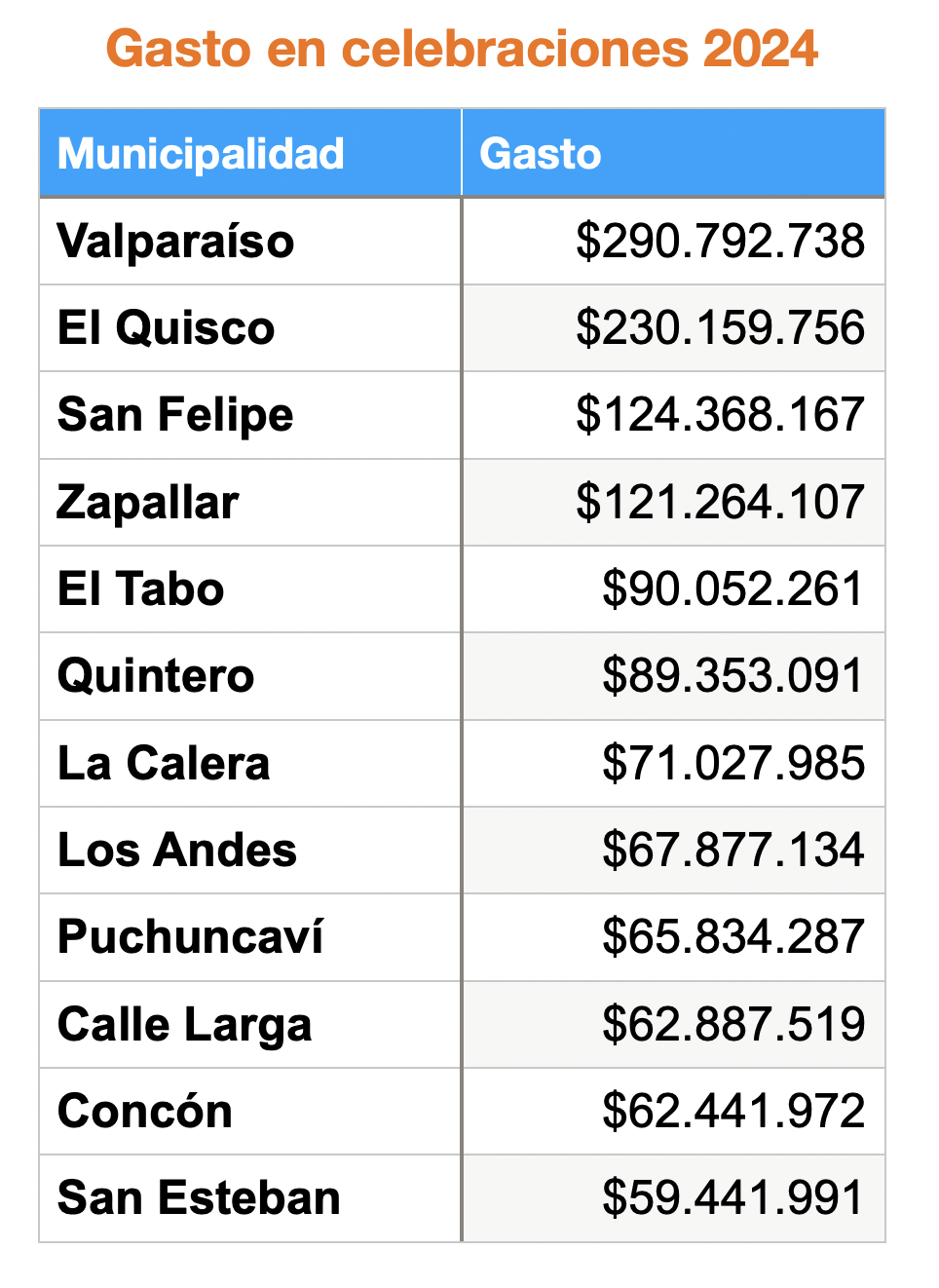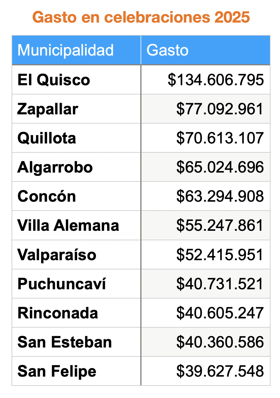 En esa primera entrega, dentro de la región de Valparaíso solo se mencionó a la Municipalidad de El Quisco –entre las de mayores gastos totales en celebraciones– y a la Municipalidad de Zapallar, que destacó por su alto gasto per cápita.