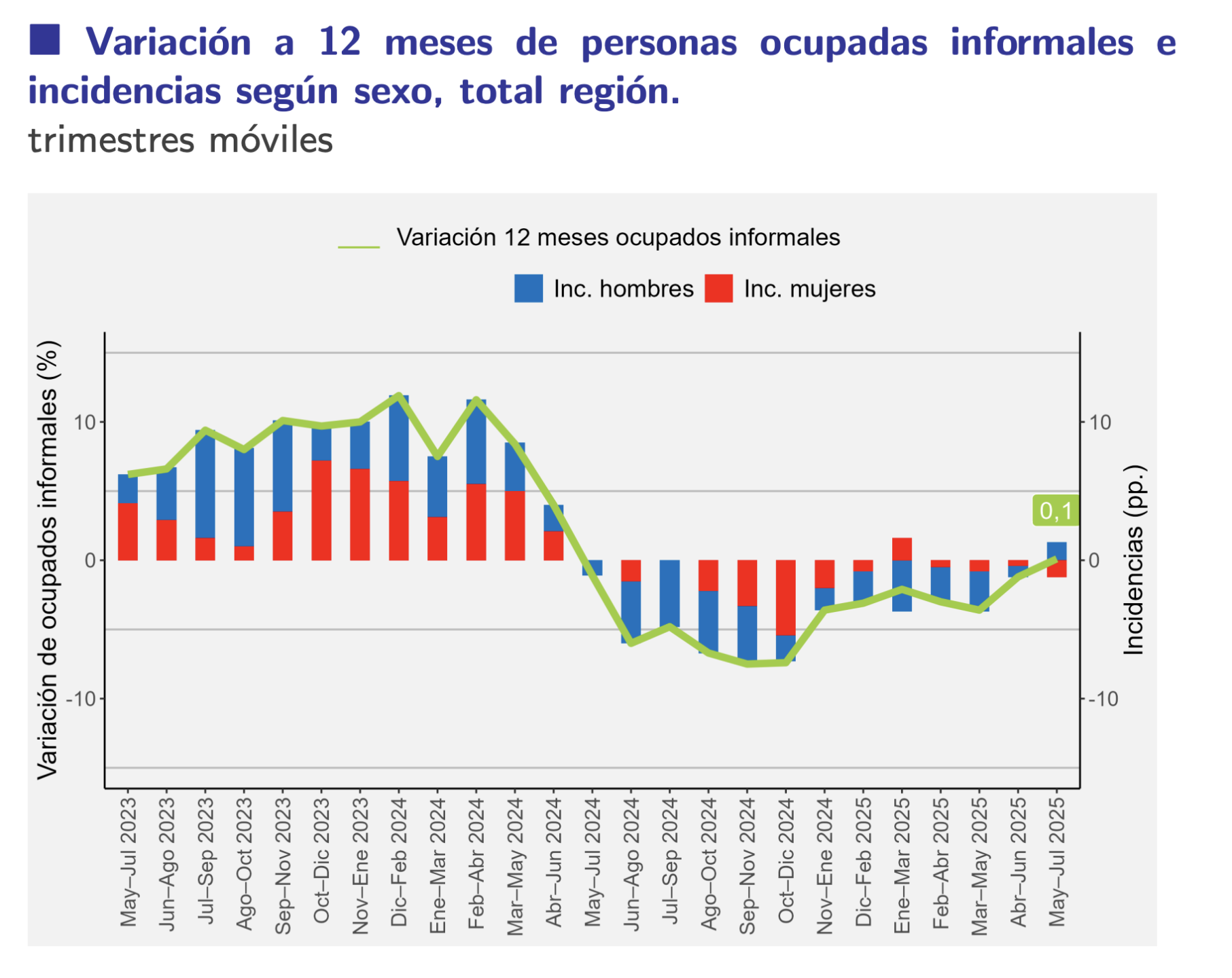 Finalmente, la tasa de ocupación informal alcanzó 28,8%, disminuyendo 0,5 puntos en doce meses. Asimismo, las personas ocupadas informales aumentaron 0,1%, incididas por los hombres (2,5%) y por las personas asalariadas informales (4,9%).