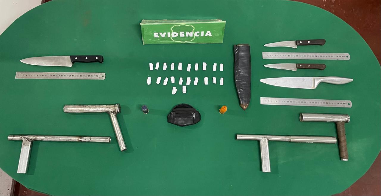 Ante esta situación, el personal policial realizó un control de identidad y la revisión de sus vestimentas, encontrando entre sus pertenencias dos escopetas de fabricación artesanal, además de cinco armas blancas de distinto tamaño y droga.